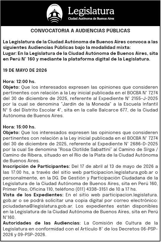 GOBIERNO | LEGISLATURA EL DIARIO DIGITAL DE LA CIUDAD SeguirSeguir Inicio Cine y Teatro Literatura Música y Shows Staff Contacto Ciudad:Devolvió 600 propiedades a sus dueños,que estaban tomadas Mar 5, 2026 | Ciudad, sociedad-y-culturaEl compromiso de orden y seguridad en la Ciudad se sostiene en... leer más La Legislatura ratifica su compromiso con la Certificación ISO 9001 Mar 5, 2026 | Ciudad, sociedad-y-culturaEn un acto realizado en el Salón Montevideo, la Legislatura de... leer más Ciudad:Presentaron los ejes de gestión en Asuntos Gremiales Mar 5, 2026 | Ciudad, sociedad-y-culturaLa Subsecretaría de Trabajo y Empleo de la Ciudad Autónoma de... leer más Colegiales:Detuvieron dos colombianos , por robos Mar 5, 2026 | Ciudad, comunasEl operativo se inició a partir de una alerta irradiada sobre... leer más Parque Patricios:Custodian los edificios evacuados tras el derrumbe Mar 4, 2026 | Ciudad, comunasEn el marco del operativo de emergencia tras el derrumbe del... leer más Charla sobre las mujeres pioneras en la política de la Ciudad Mar 4, 2026 | Ciudad, sociedad-y-culturaDurante el desarrollo del mes de la mujer se ofrecerá una charla... leer más La ciudad:Declaró de Interés a la murga “Los Inconscientes de Almagro” Mar 4, 2026 | Ciudad, sociedad-y-culturaLa Legislatura de la Ciudad de Buenos Aires declaró de Interés... leer más Ciudad:Se presenta la Orquesta Argentina de Mujeres Celia Torrá Mar 4, 2026 | Ciudad, sociedad-y-culturaEn el marco de la celebración del Día Internacional de la Mujer... leer más Legislatura porteña:Jorge Macri abrió el período de sesiones ordinarias Mar 3, 2026 | Ciudad, sociedad-y-culturaEl jefe de Gobierno de la Ciudad, Jorge Macri, encabezó este... leer más SUBTE:Hoy cierra la estación Tribunales por obras de renovación Mar 2, 2026 | Ciudad, transitoEn el marco del Plan de Renovación Integral de Estaciones... leer más « Entradas más antiguas B ‘ H SECCIONES Ciudad Comunas / Barrios Dirigentes Organismos de la Ciudad Sociedad y Cultura Tránsito Nación Gobierno Política Provincia Gobierno Política Deportes 1° División A 1° B Nacional 1° B Metropolitana 1° División C 1° División D Selección Argentina Fútbol Internacional El tiempo - Tutiempo.net MÁS INFO En el portal del Gobierno de la Ciudad de Buenos Aires:www.buenosaires.gob.ar VIDEO DE VOCES DE BAIRES STAFF Editor responsable: José Mansill info@vocesdebaires.com.ar Reg. Propiedad Intelectual N° RL-2019-63853139 Más artículos… Más artículos… Elegir el mes marzo 2026 febrero 2026 enero 2026 diciembre 2025 noviembre 2025 octubre 2025 septiembre 2025 agosto 2025 julio 2025 junio 2025 mayo 2025 abril 2025 marzo 2025 febrero 2025 enero 2025 diciembre 2024 noviembre 2024 octubre 2024 septiembre 2024 agosto 2024 julio 2024 junio 2024 mayo 2024 abril 2024 marzo 2024 febrero 2024 enero 2024 diciembre 2023 noviembre 2023 octubre 2023 septiembre 2023 agosto 2023 julio 2023 junio 2023 mayo 2023 abril 2023 marzo 2023 febrero 2023 enero 2023 diciembre 2022 noviembre 2022 octubre 2022 septiembre 2022 agosto 2022 julio 2022 junio 2022 mayo 2022 abril 2022 marzo 2022 febrero 2022 enero 2022 diciembre 2021 noviembre 2021 octubre 2021 septiembre 2021 agosto 2021 julio 2021 junio 2021 mayo 2021 abril 2021 marzo 2021 febrero 2021 enero 2021 diciembre 2020 noviembre 2020 octubre 2020 septiembre 2020 agosto 2020 julio 2020 junio 2020 mayo 2020 abril 2020 marzo 2020 febrero 2020 enero 2020 diciembre 2019 noviembre 2019 octubre 2019 septiembre 2019 agosto 2019 julio 2019 junio 2019 mayo 2019 abril 2019 marzo 2019 febrero 2019 enero 2019 diciembre 2018 noviembre 2018 octubre 2018 septiembre 2018 agosto 2018 julio 2018 junio 2018 mayo 2018 abril 2018 marzo 2018 febrero 2018 enero 2018 diciembre 2017 noviembre 2017 octubre 2017 septiembre 2017 agosto 2017 julio 2017 junio 2017 mayo 2017 abril 2017 marzo 2017 enero 2017 diciembre 2016 noviembre 2016 octubre 2016 septiembre 2016 agosto 2016 julio 2016 junio 2016 mayo 2016 abril 2016 marzo 2016 diciembre 2015 noviembre 2015 octubre 2015 septiembre 2015 agosto 2015 julio 2015 junio 2015 mayo 2015 abril 2015 marzo 2015 febrero 2015 enero 2015 diciembre 2014 noviembre 2014 octubre 2014 septiembre 2014 agosto 2014 julio 2014 junio 2014 mayo 2014 abril 2014 marzo 2014 febrero 2014 enero 2014 diciembre 2013 noviembre 2013 octubre 2013 septiembre 2013 agosto 2013 julio 2013 junio 2013 mayo 2013 abril 2013 marzo 2013 febrero 2013 enero 2013 diciembre 2012 noviembre 2012 octubre 2012 septiembre 2012 agosto 2012 julio 2012 junio 2012 mayo 2012 abril 2012 marzo 2012 febrero 2012 enero 2012 julio 2011 junio 2011 mayo 2011 abril 2011 marzo 2011 febrero 2011 VBA NOTICIERO PARLAMENTARIO VIDEO DESTACADO SeguirSeguir