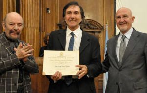 Foto 1- El Ciudadano Ilustre Horacio Ferrer; Pepe Trelles con el diploma de Personalidad Destacada y el Diputado Oscar Moscariello (PRO)