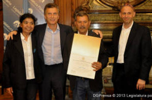 Durante un acto realizado en el Salón Dorado del Palacio Legislativo, Isidro Antunez recibió el diploma de Personalidad Destacada de la Ciudad Autónoma de Buenos Aires en el ámbito de los Derechos Sociales de manos del Jefe de Gobierno, Mauricio Macri. La distinción es producto de una iniciativa del diputado Sergio Bergman. "Me genera mucho honor y alegría la relación que tengo con Margarita e Isidro, hace cuatro años que nos conocemos y trabajamos juntos. La labor de él es ayudar a que su familia, el barrio y todos esten mejor. Es un orgullo poder homenajear a este luchador incansable", argumentó Macri en la apertura del acto. Por su parte, el impulsor de la iniciativa, Diputado Sergio Bergman (PRO), afirmó que "es un honor para la Legislatura entregarle el diploma a un hombre tan comprometido con la sociedad". Y luego concluyó: "Donde hay amor y compromiso es posible que nos sumemos todos, y cuando se ayuda a otras personas nos ayudamos a nosotros mismos. Isidro es un gran ejemplo de ésto". El homenajeado se mostró muy emocionado por la distinción y le agradeció a las autoridades, a su esposa Margarita y a su familia. Participaron del evento amigos y familiares del homenajeado, y las Diputadas del bloque PRO Diana Martínez Barrios, Carmen Polledo, Raquel Herrero y Victoria Morales Gorleri.