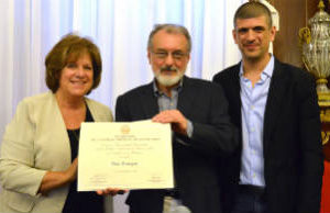 Foto: Bas Castagna al recibir la distinción de Personalidad Destacada de la Cultura de manos de la diputada Diana Martínez
