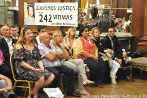 Foto 1 – En el Salón «San Martín», la diputada María Rosa Muiños (izq.) junto a familiares y amigos de víctimas