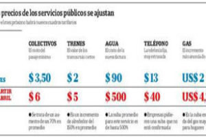Quienes residen en la Capital Federal y el conurbano bonaerense sufrirán desde el mes próximo un aumento de hasta 500% en algunos de los principales servicios públicos, como el agua, los trenes, los colectivos, gas y el subte. El Gobierno acelera la definición de los últimos detalles para que al menos una parte de esos incrementos se anuncie pasado mañana.Como contrapartida, todos los aumentos llevarán en el reverso la promesa de una tarifa social, que regirá para los sectores de menores ingresos, como ocurrió con el incremento en las tarifas eléctricas. Por eso algunos consumidores podrían ver incluso disminuido el peso de los servicios públicos en su economía doméstica, según el argumento oficial.