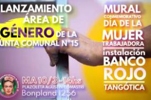 El martes 10 de marzo, a las 14 horas, se realizará un acto para conmemorar el Día Internacional de la Mujer Trabajadora en la Comuna 15. En esta oportunidad se lanzará el área de Género de la Junta Comunal 15, que estará encabezada por la comunera Nancy Bolaño del Frente de Todos. La actividad comenzará con la inauguración de un mural alusivo pintado por la artista Victoria Ferreyra de la Fundación Pinta Argentina en la plazoleta Agustín Comastri, ubicada en la esquina de Av. Córdoba y Bonpland. Luego, en el patio de la Sede Comunal 15, ubicada en Bonpland 1271, se inaugurará un banco rojo con la leyenda “No a la violencia de género. Por más equidad, respeto y autonomía”. Además, el grupo Tangótica bailará tango feminista.