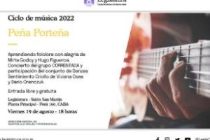 El viernes 19 de agosto a las 18 horas en el Salón San Martín del Palacio Legislativo, Perú 160, tendrá lugar una nueva peña Porteña como parte de Ciclo de Música 2022.