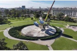 Para el movimiento se debieron desmontar cuidadosamente los dos pétalos caídos y así evitar daños en el mecanismo de apertura, que, de acuerdo a los estudios previos, aún funciona. Se evaluaron diferentes opciones de desacople, con “power hidráulico” o soplete de oxiacetileno, decisión que se tomó con el inicio de la operación de traslado, ya que es necesario sostener el pétalo con las lingas de la grúa para poder trabajar y definir la modalidad. Además, el traslado implicó tareas de mantenimiento en la Plaza de las Naciones Unidas antes y después del trabajo de las grúas: retiro y colocación de rejas, movimiento de mobiliario, aporte de tierra y nivelación, posible reparación de solados, sistema de riego, césped y canteros, tareas de poda y tendido de luminarias.